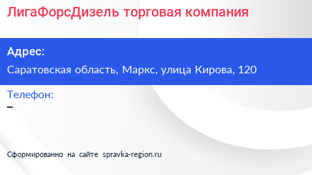 ЛигаФорсДизель, торговая компания по адресу Саратовская область, Маркс, улица Кирова, 120 в дальнейшем Организация, размещена в следующих категориях: