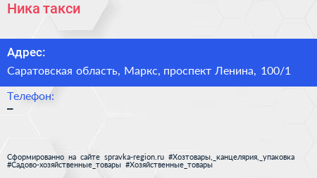 Ника, такси по адресу Саратовская область, Маркс, проспект Ленина, 100/1 в дальнейшем Организация, размещена в следующих категориях: