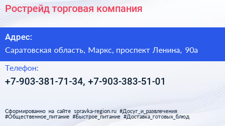 Рострейд, торговая компания по адресу Саратовская область, Маркс, проспект Ленина, 90а в дальнейшем Организация, размещена в следующих категориях: