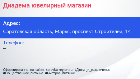 Диадема, ювелирный магазин по адресу Саратовская область, Маркс, проспект Строителей, 14 в дальнейшем Организация, размещена в следующих категориях: