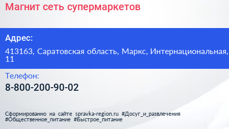 Магнит, сеть супермаркетов по адресу 413163, Саратовская область, Маркс, Интернациональная, 11 в дальнейшем Организация, размещена в следующих категориях: