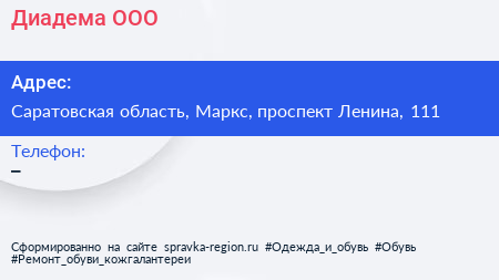 Диадема, ООО по адресу Саратовская область, Маркс, проспект Ленина, 111 в дальнейшем Организация, размещена в следующих категориях: