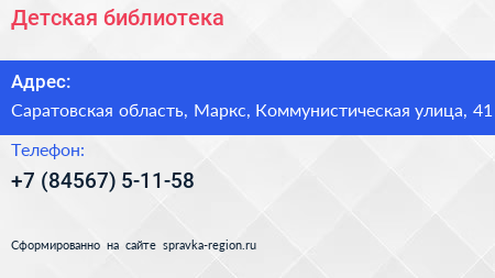 Детская библиотека по адресу Саратовская область, Маркс, Коммунистическая улица, 41 в дальнейшем Организация, размещена в следующих категориях: