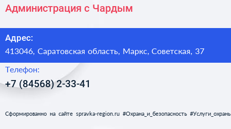 Администрация, с. Чардым по адресу 413046, Саратовская область, Маркс, Советская, 37 в дальнейшем Организация, размещена в следующих категориях: