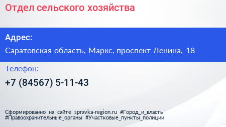 Отдел сельского хозяйства по адресу Саратовская область, Маркс, проспект Ленина, 18 в дальнейшем Организация, размещена в следующих категориях: