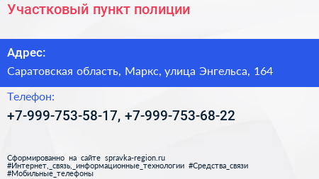 Участковый пункт полиции по адресу Саратовская область, Маркс, улица Энгельса, 164 в дальнейшем Организация, размещена в следующих категориях: