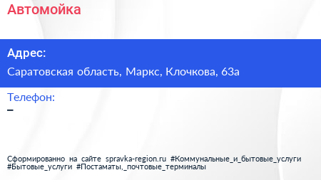 Автомойка по адресу Саратовская область, Маркс, Клочкова, 63а в дальнейшем Организация, размещена в следующих категориях: