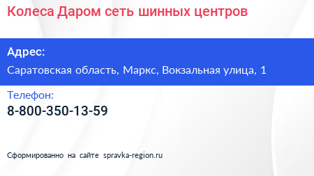 Колеса Даром, сеть шинных центров по адресу Саратовская область, Маркс, Вокзальная улица, 1 в дальнейшем Организация, размещена в следующих категориях: