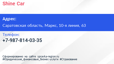 Shine Car по адресу Саратовская область, Маркс, 10-я линия, 63 в дальнейшем Организация, размещена в следующих категориях: