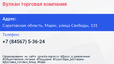 Вулкан, торговая компания по адресу Саратовская область, Маркс, улица Свободы, 131 в дальнейшем Организация, размещена в следующих категориях:
