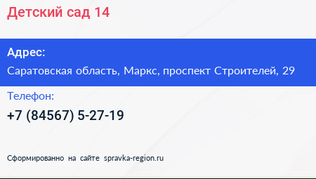 Детский сад №14 по адресу Саратовская область, Маркс, проспект Строителей, 29 в дальнейшем Организация, размещена в следующих категориях: