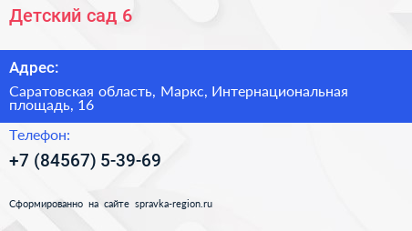 Детский сад №6 по адресу Саратовская область, Маркс, Интернациональная площадь, 16 в дальнейшем Организация, размещена в следующих категориях: