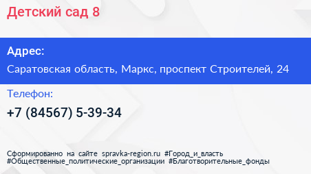 Детский сад №8 по адресу Саратовская область, Маркс, проспект Строителей, 24 в дальнейшем Организация, размещена в следующих категориях: