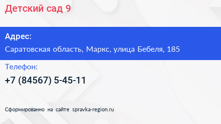 Детский сад №9 по адресу Саратовская область, Маркс, улица Бебеля, 185 в дальнейшем Организация, размещена в следующих категориях:
