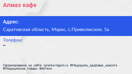 Алмаз, кафе по адресу Саратовская область, Маркс, с.Приволжское, 5а в дальнейшем Организация, размещена в следующих категориях: