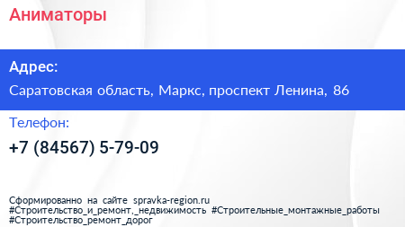 Аниматоры по адресу Саратовская область, Маркс, проспект Ленина, 86 в дальнейшем Организация, размещена в следующих категориях: