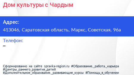 Дом культуры, с. Чардым по адресу 413046, Саратовская область, Маркс, Советская, 96а в дальнейшем Организация, размещена в следующих категориях:
