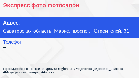 Экспресс фото, фотосалон по адресу Саратовская область, Маркс, проспект Строителей, 31 в дальнейшем Организация, размещена в следующих категориях: