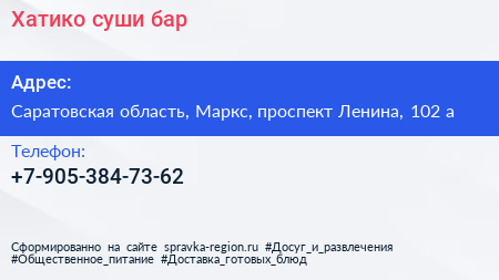 Хатико, суши-бар по адресу Саратовская область, Маркс, проспект Ленина, 102 а в дальнейшем Организация, размещена в следующих категориях: