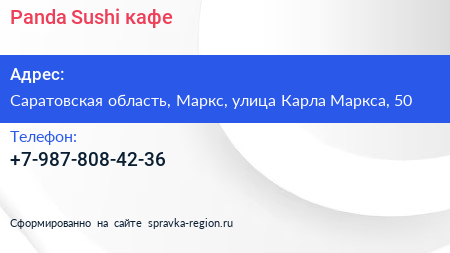 Panda Sushi, кафе по адресу Саратовская область, Маркс, улица Карла Маркса, 50 в дальнейшем Организация, размещена в следующих категориях: