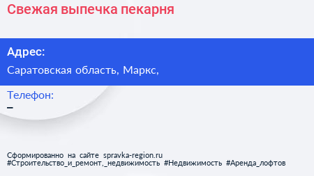 Свежая выпечка, пекарня по адресу Саратовская область, Маркс, в дальнейшем Организация, размещена в следующих категориях: