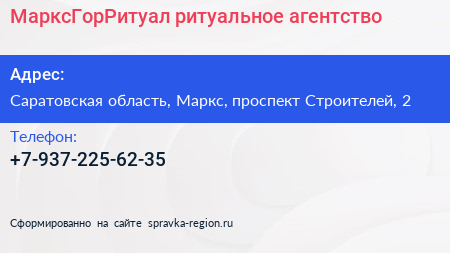 МарксГорРитуал, ритуальное агентство по адресу Саратовская область, Маркс, проспект Строителей, 2 в дальнейшем Организация, размещена в следующих категориях: