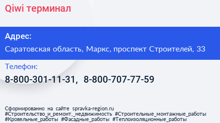 Qiwi, терминал по адресу Саратовская область, Маркс, проспект Строителей, 33 в дальнейшем Организация, размещена в следующих категориях:
