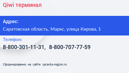 Qiwi, терминал по адресу Саратовская область, Маркс, улица Кирова, 1 в дальнейшем Организация, размещена в следующих категориях: