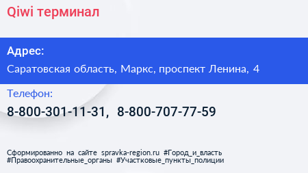 Qiwi, терминал по адресу Саратовская область, Маркс, проспект Ленина, 4 в дальнейшем Организация, размещена в следующих категориях: