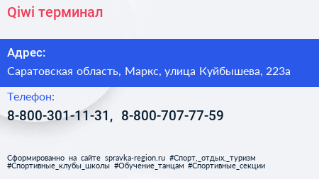 Qiwi, терминал по адресу Саратовская область, Маркс, улица Куйбышева, 223а в дальнейшем Организация, размещена в следующих категориях: