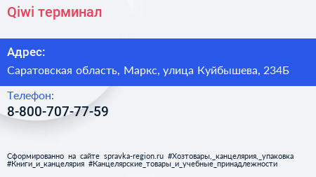 Qiwi, терминал по адресу Саратовская область, Маркс, улица Куйбышева, 234Б в дальнейшем Организация, размещена в следующих категориях: