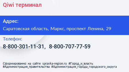 Qiwi, терминал по адресу Саратовская область, Маркс, проспект Ленина, 29 в дальнейшем Организация, размещена в следующих категориях: