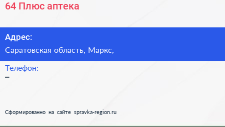64 Плюс, аптека по адресу Саратовская область, Маркс, в дальнейшем Организация, размещена в следующих категориях:
