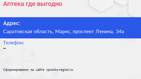 Аптека где выгодно по адресу Саратовская область, Маркс, проспект Ленина, 34а в дальнейшем Организация, размещена в следующих категориях: