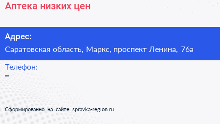 Аптека низких цен по адресу Саратовская область, Маркс, проспект Ленина, 76а в дальнейшем Организация, размещена в следующих категориях: