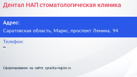 Дентал-НАП, стоматологическая клиника по адресу Саратовская область, Маркс, проспект Ленина, 94 в дальнейшем Организация, размещена в следующих категориях: