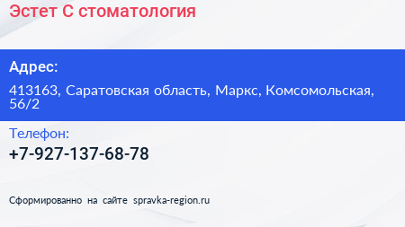 Эстет-С, стоматология по адресу 413163, Саратовская область, Маркс, Комсомольская, 56/2 в дальнейшем Организация, размещена в следующих категориях: