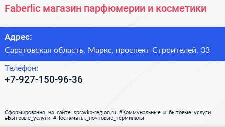 Faberlic, магазин парфюмерии и косметики по адресу Саратовская область, Маркс, проспект Строителей, 33 в дальнейшем Организация, размещена в следующих категориях: