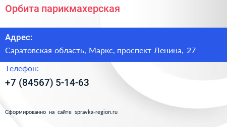 Орбита, парикмахерская по адресу Саратовская область, Маркс, проспект Ленина, 27 в дальнейшем Организация, размещена в следующих категориях: