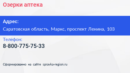 Озерки, аптека по адресу Саратовская область, Маркс, проспект Ленина, 103 в дальнейшем Организация, размещена в следующих категориях: