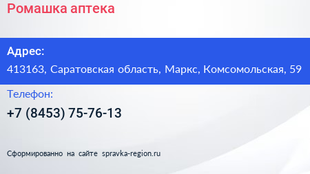 Ромашка, аптека по адресу 413163, Саратовская область, Маркс, Комсомольская, 59 в дальнейшем Организация, размещена в следующих категориях: