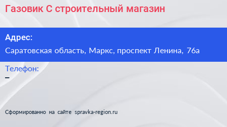 Газовик-С, строительный магазин по адресу Саратовская область, Маркс, проспект Ленина, 76а в дальнейшем Организация, размещена в следующих категориях: