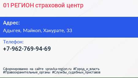 01 РЕГИОН, страховой центр по адресу Адыгея, Майкоп, Хакурате, 33 в дальнейшем Организация, размещена в следующих категориях: