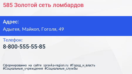 585*Золотой, сеть ломбардов по адресу Адыгея, Майкоп, Гоголя, 49 в дальнейшем Организация, размещена в следующих категориях: