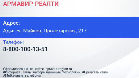 АРМАВИР РЕАЛТИ по адресу Адыгея, Майкоп, Пролетарская, 217 в дальнейшем Организация, размещена в следующих категориях: