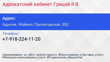 Адвокатский кабинет Грицай Я.В. по адресу Адыгея, Майкоп, Пролетарская, 302 в дальнейшем Организация, размещена в следующих категориях: