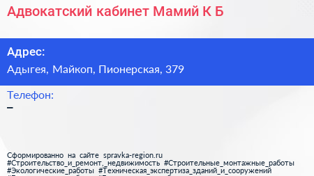 Адвокатский кабинет Мамий К.Б. по адресу Адыгея, Майкоп, Пионерская, 379 в дальнейшем Организация, размещена в следующих категориях: