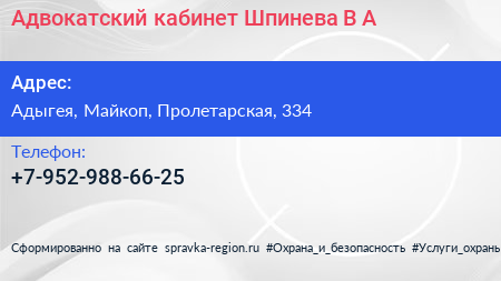 Адвокатский кабинет Шпинева В.А. по адресу Адыгея, Майкоп, Пролетарская, 334 в дальнейшем Организация, размещена в следующих категориях: