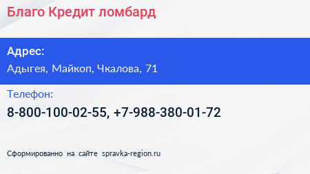 Благо Кредит, ломбард по адресу Адыгея, Майкоп, Чкалова, 71 в дальнейшем Организация, размещена в следующих категориях: