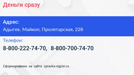 Деньги сразу по адресу Адыгея, Майкоп, Пролетарская, 228 в дальнейшем Организация, размещена в следующих категориях: